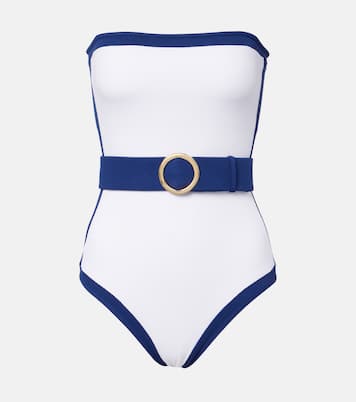 Die Bademode von Alexandra Miro fokussiert sich auf selbstbewusste und moderne Silhouetten. Der Whitney Badeanzug präsentiert sich als schickes Bandeau-Design mit abnehmbarem Gürtel und Schnalle für ein vielseitiges Styling.
