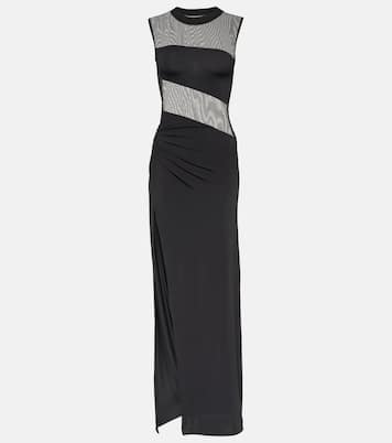 Nensi Dojaka se définit par une allure féminine contemporaine, à l’image de cette robe longue. Composée d’empiècements de jersey sculptant et de résille transparente, elle présente une coupe slim avec une fente latérale.