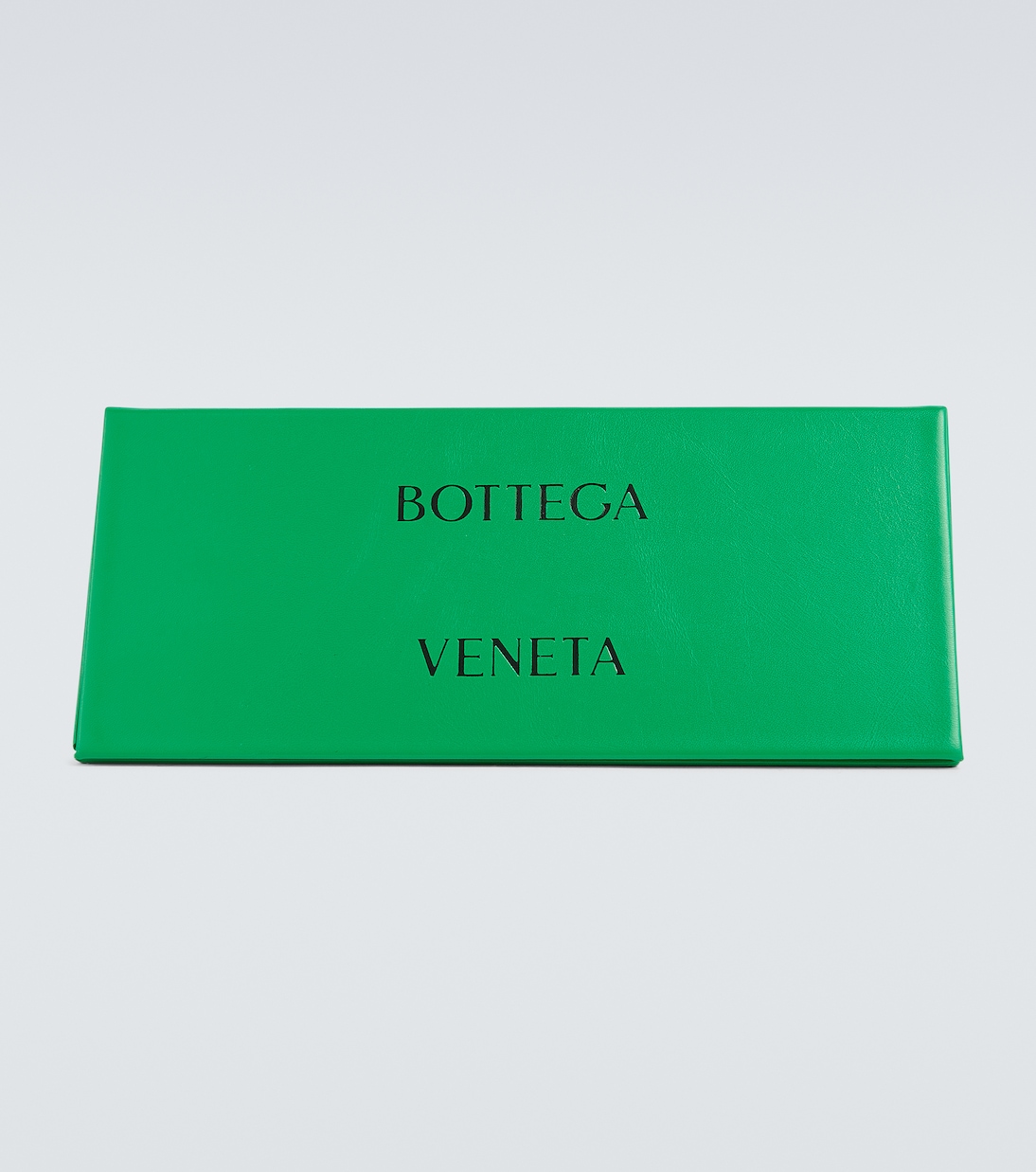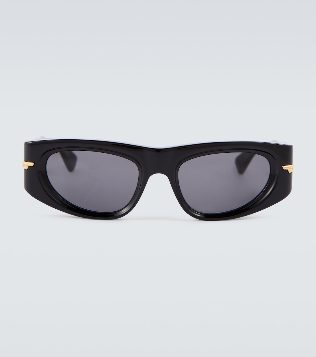 Diese Sonnenbrille von Bottega Veneta besitzt eine schmale Silhouette im Retro-Stil, die durch das schwarze Acetat und goldfarbene Einsätze besonders gut zur Geltung kommt.