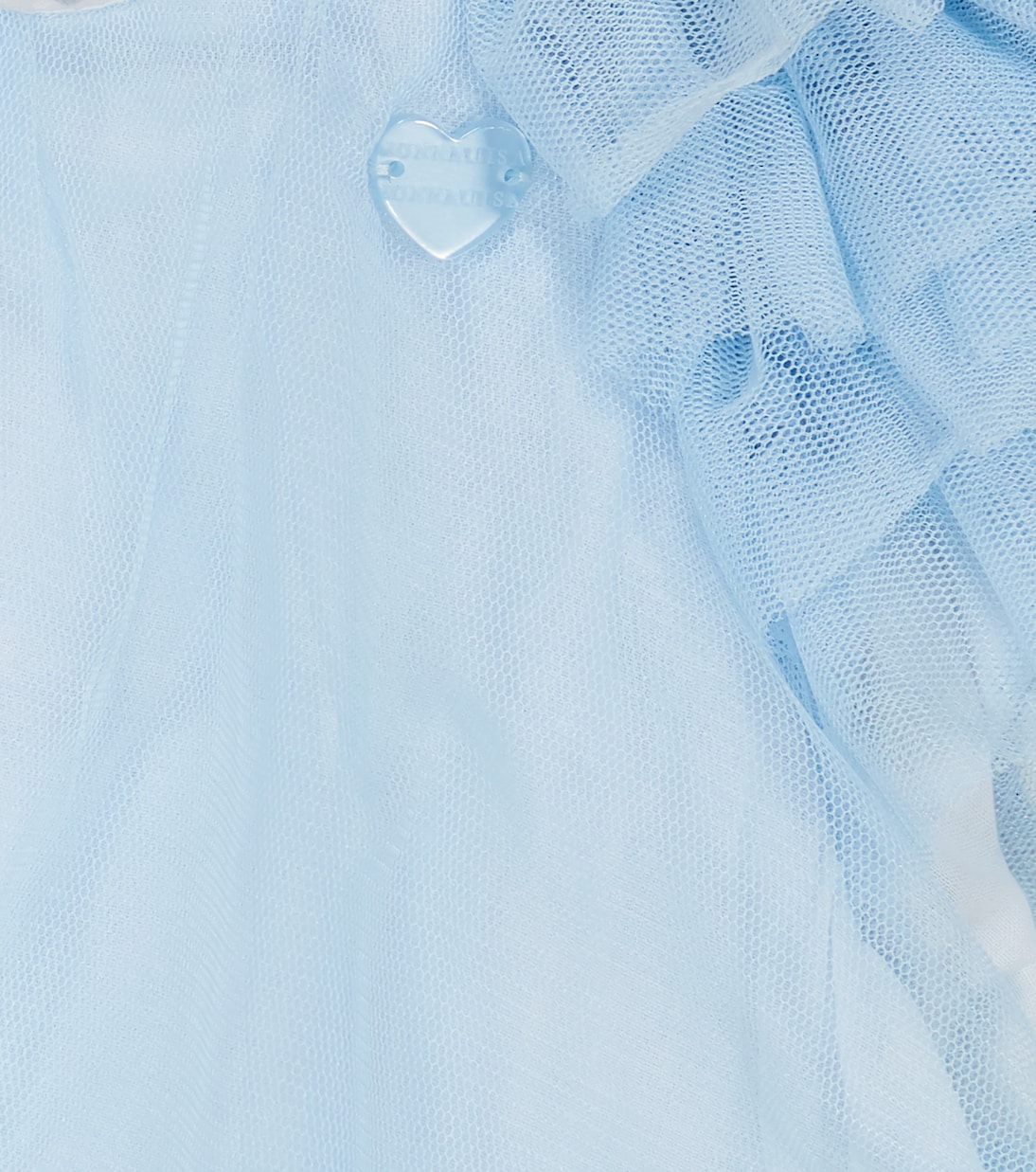 Dieses Kleid von Monnalisa wurde aus blauem Tüll gefertigt und für zusätzlichen Tragekomfort mit einem weichen Musselin-Futter versehen. Das Modell verfügt über einen gerüschten A-Linien-Rock und eine kleine herzförmige Applikation auf der Brust.
