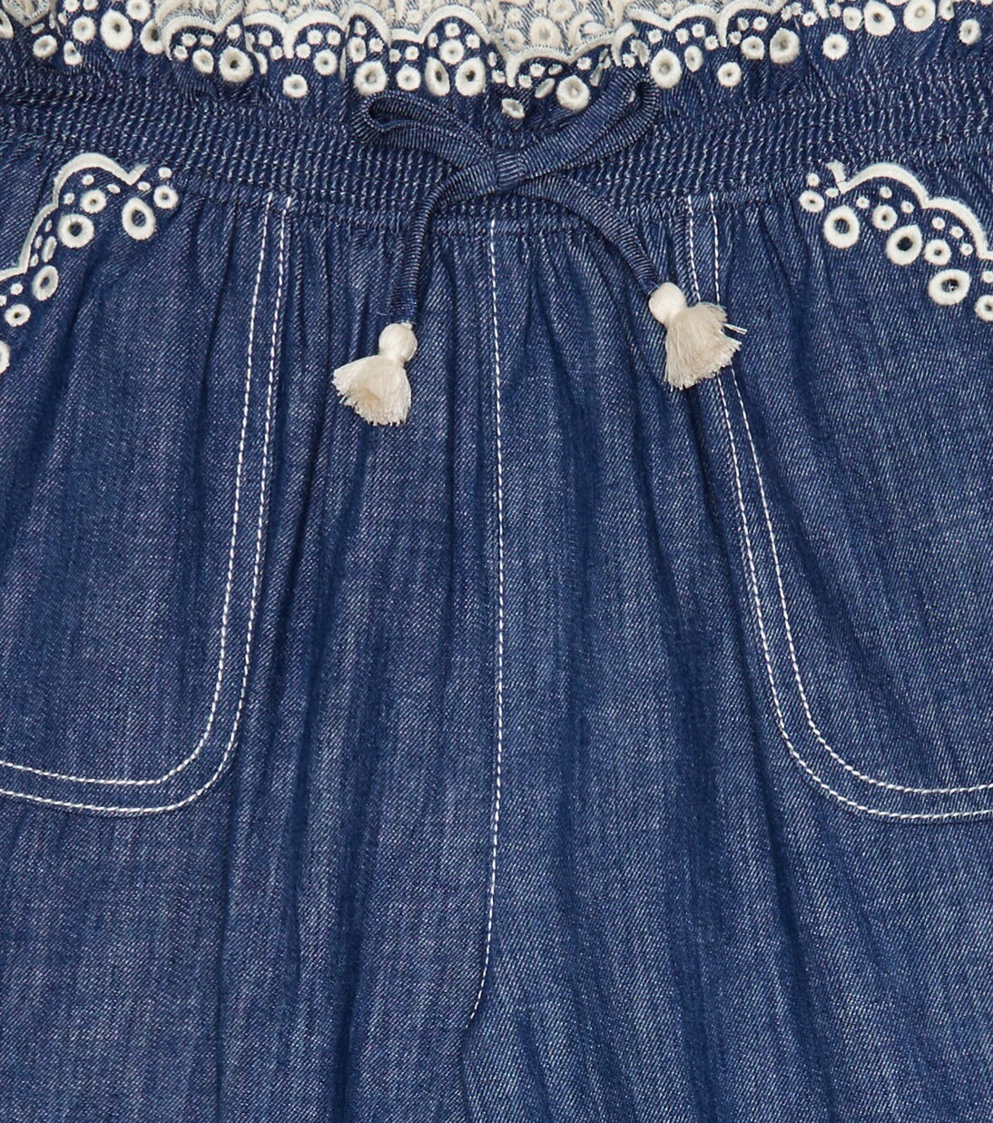 Die Tiggy Scallop Jeans wurden aus reiner Baumwolle gefertigt und verfügen über eine gekräuselte Taille mit Bindebändern, die mit Troddeln versehen sind. Die Highlights dieses Modells sind der gewellte Saum und die bestickten Besätze.