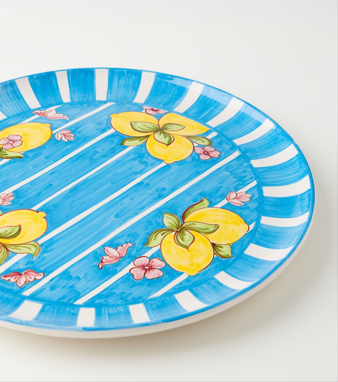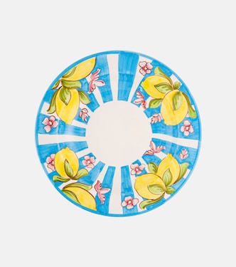 Diese Servierplatte ist Teil der exklusiven Taormina Kollektion von Dolce&Gabbana x Mytheresa und wurde aus Keramik gefertigt. Hier treffen mediterrane Motive, wie Zitronen und zarte Blumen auf einen weiß-blau gestreiften Untergrund.