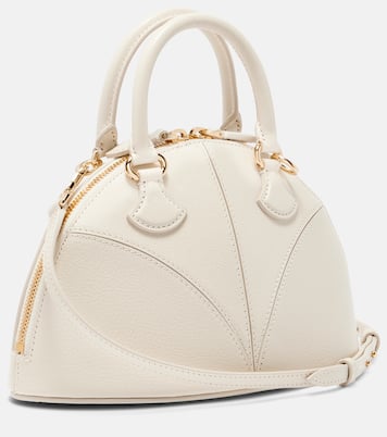 Crafted from supple leather, the Marquise Small tote bag from Bvlgari draws inspiration from its namesake gem with clean lines and a structured silhouette. Gold-tone hardware, rounded top handles, and a logo-engraved mirror charm complete the elegant design.