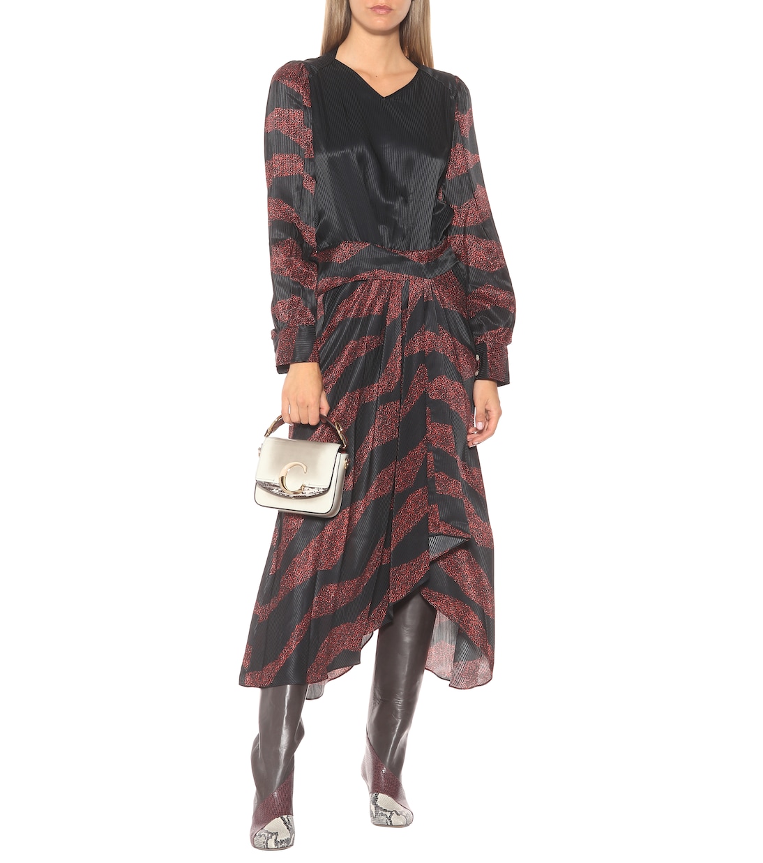 Isabel Marant maîtrise l'art des imprimés et du chic décontracté, en témoignent cette robe en satin et ses zébrures noires répondant à un motif léopard stylisé rouge. Pourvue d'un corsage uni à encolure en V, elle souligne la taille d'un empiècement ton sur ton avant de s'évaser en une jupe aérienne. Des bottes en cuir lui siéront à merveille.