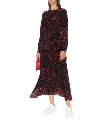 Stella McCartney signe votre compagne d'un prochain dîner chic avec cette délicieuse robe en soie aérienne noire à pois rouge. Ce modèle long et épuré se distingue par sa coupe subtilement évasée et appellera une paire de bottines à talons hauts, notamment.