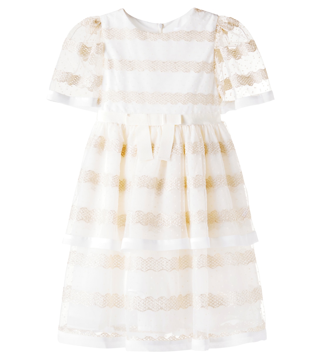 Questo abito di Patachou è realizzato in delicato tulle ricamato, con un elegante fiocco in vita e maniche con volant.