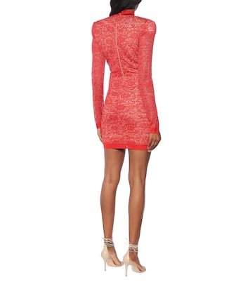 Sensuale pizzo rosso e silhouette scultorea per il miniabito firmato Balmain. La sua silhouette aderente con spalline accentuate lo rende un capo statement perfetto per il prossimo party con stivaletti a calza e clutch.