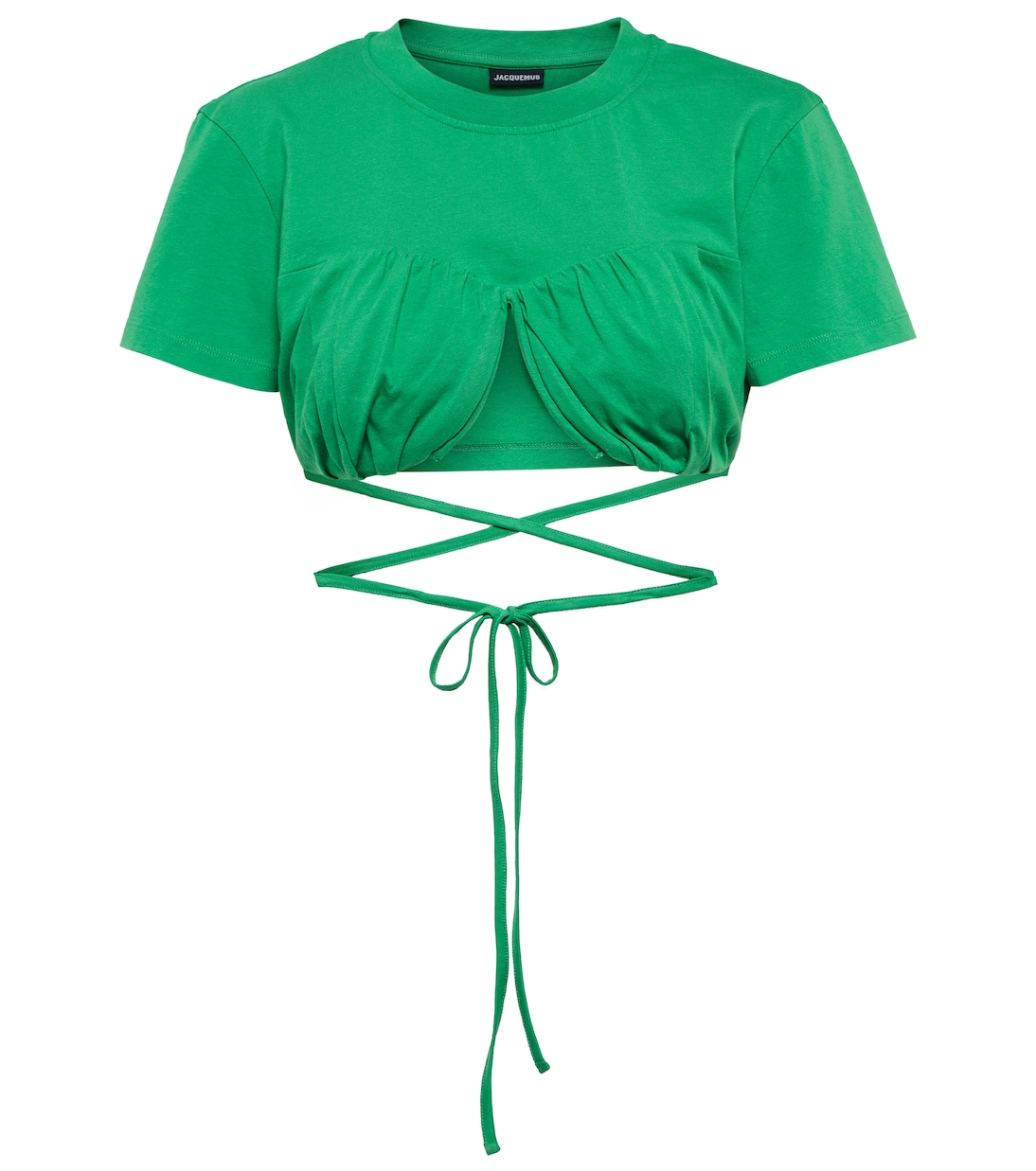Jacquemus regala un tocco di sensualità agli evergreen del guardaroba con il top cropped verde Baci. Realizzato in soffice jersey di cotone, è definito da un busto a corsetto e laccetti sottili che si avvolgono elegantemente attorno al corpo.