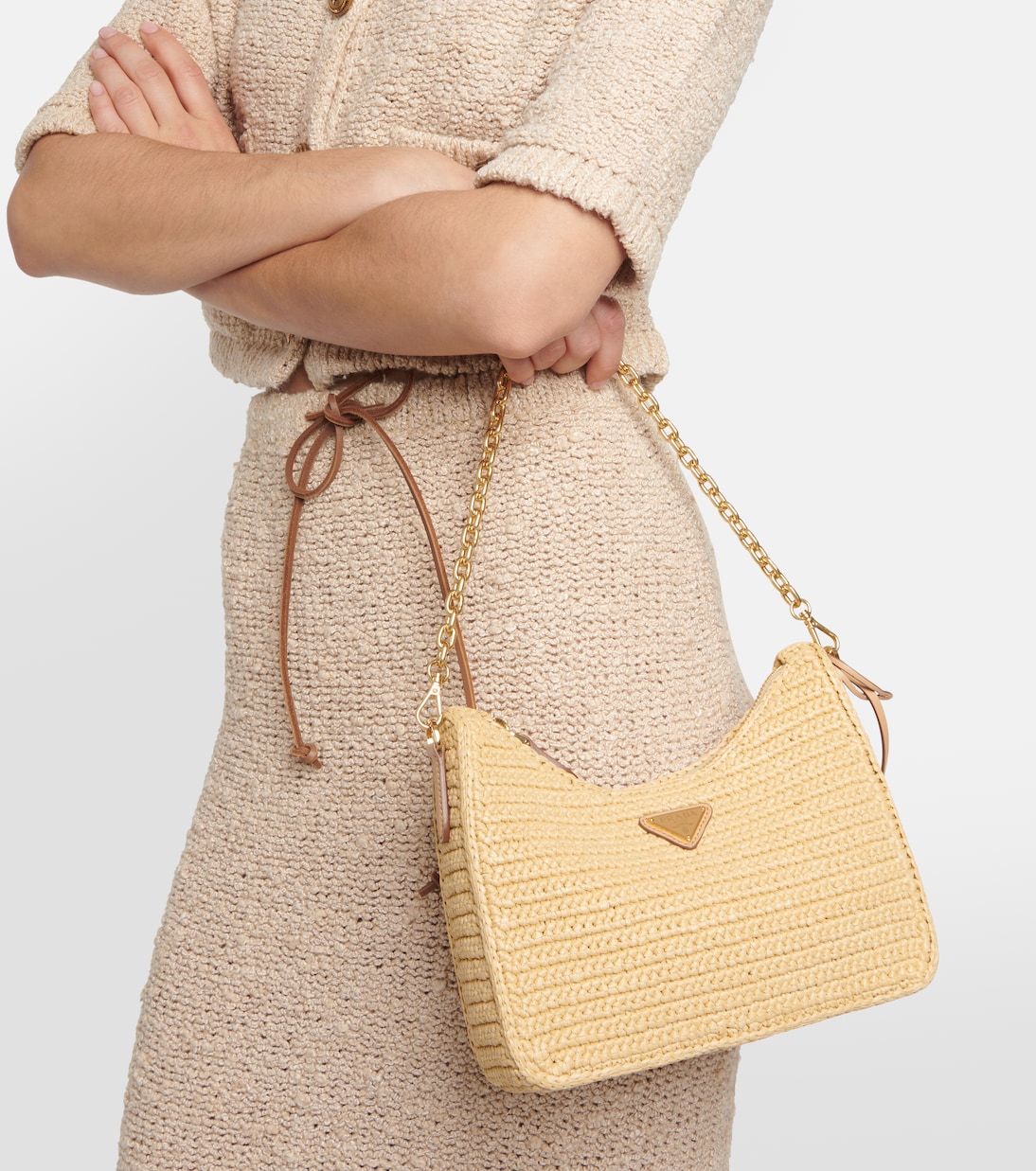 Questa lussuosa borsa a spalla di Prada riprende il design d’archivio del 2005 e lo rinnova in un'interpretazione più naturale in rafia beige. Presenta un assortimento di dettagli rimovibili, come il manico a catena dorata, la tracolla regolabile, la pochette con zip e il portachiavi con logo, che la rendono un accessorio altamente versatile, capace di adattarsi a tutte le vostre esigenze quotidiane.