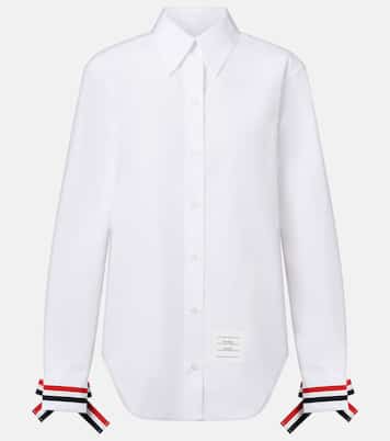 Questa incantevole camicia unisce l’eleganza intramontabile della camicia classica con un tocco iconico di Thom Browne. Realizzato in pregiato popeline di cotone, questo modello presenta un delicato fiocco sul colletto e la linguetta tricolore in grosgrain sul retro del collo.