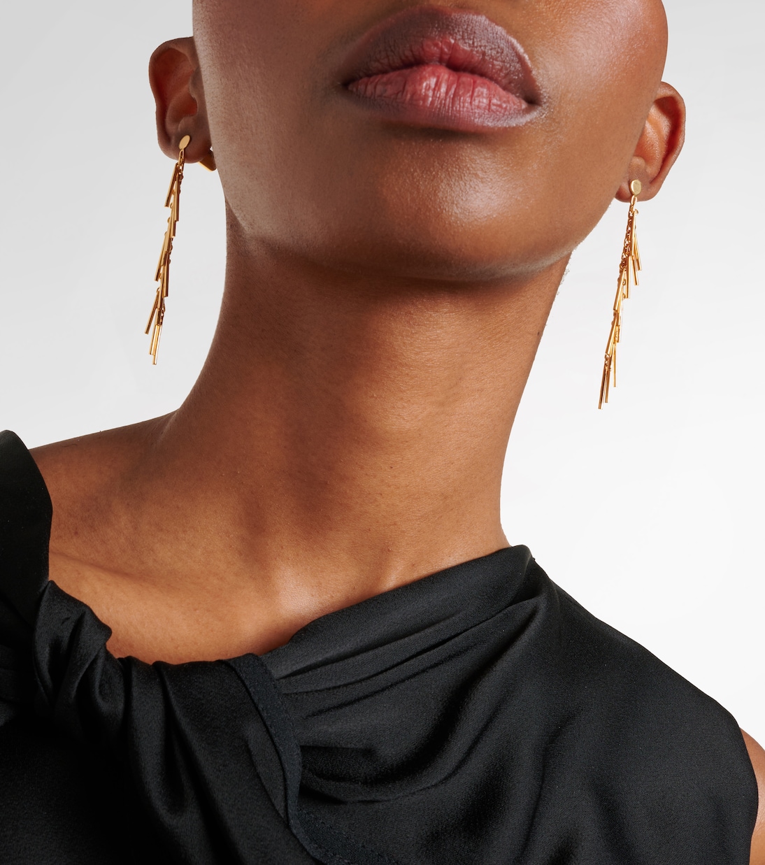 Der raffinierte Minimalismus von Jil Sander zeichnet sich durch neutrale Töne, klare Linien und präzise platzierte Details aus. Diese Ohrringe wurden in Italien aus goldfarbenem Messing gefertigt und zeigen die verspielte Seite von Jil Sander.