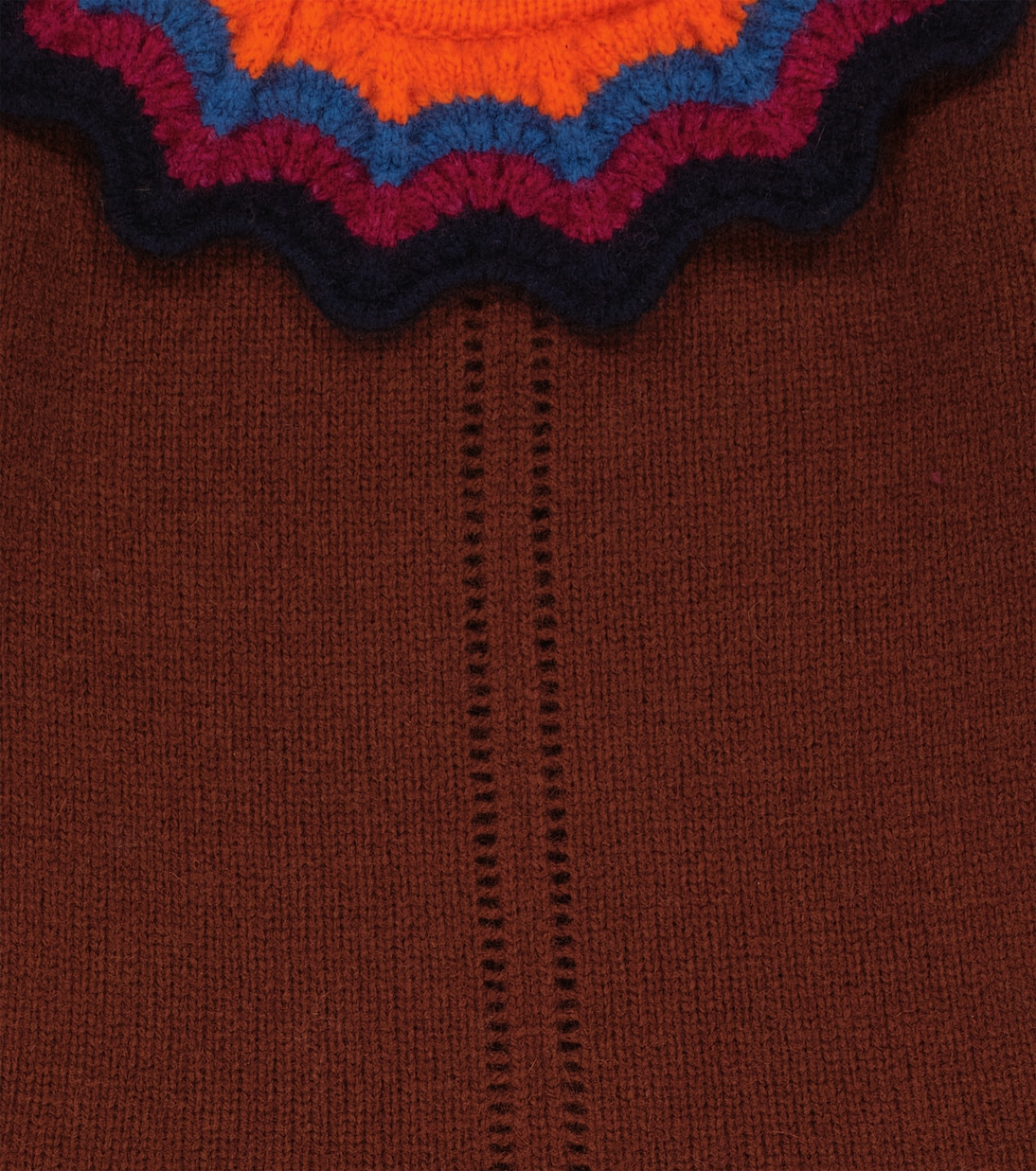 The Amberley dress from Caramel is the perfect winter dress. It's knit from a wool-blend and is accented with a colorful chevron-striped collar and ruffled trims.