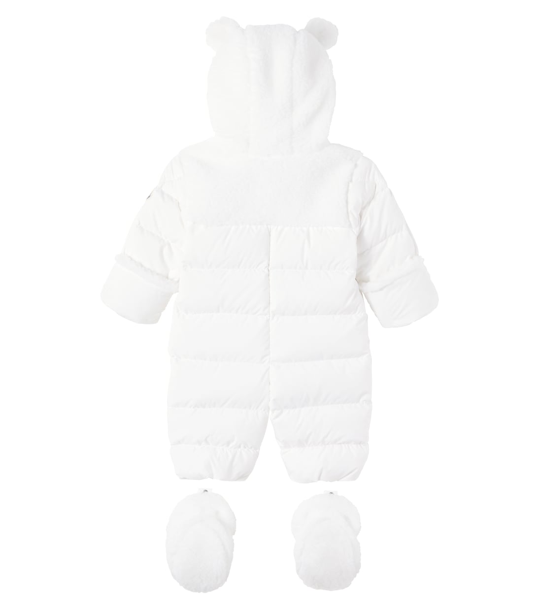 Keep them warm and cozy in the Osof snowsuit from Moncler Enfant. Filled with insulating down panels and secured with a zipped front, this baby style features a snug hood with adorable ears, detachable feet, and terry mittens.