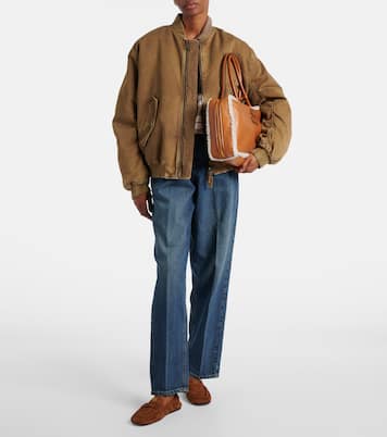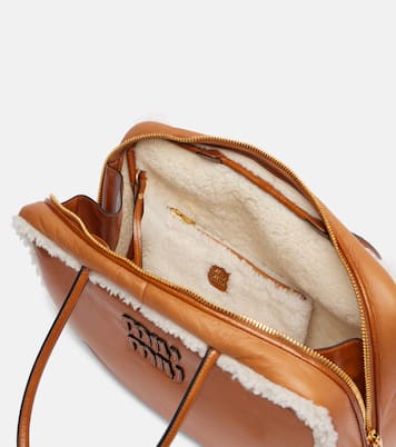 The Miu Miu Beau tote bag has a boxy silhouette that appeals to modern minimalists. Made from supple leather with a shearling lining and trims, this Large design comes with two top handles and the brand's logo embossed onto the front.