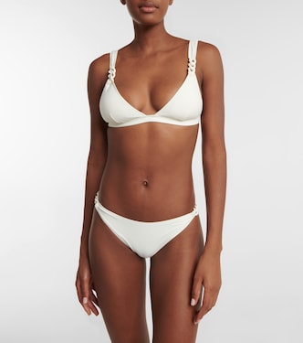 Apuesta por este top de bikini triangular de Stella McCartney para lucir una elegancia discreta en la playa. Confeccionado en tejido de baño con elastano, este modelo tiene ribete de cadena blanca y franja inferior de sujeción.
