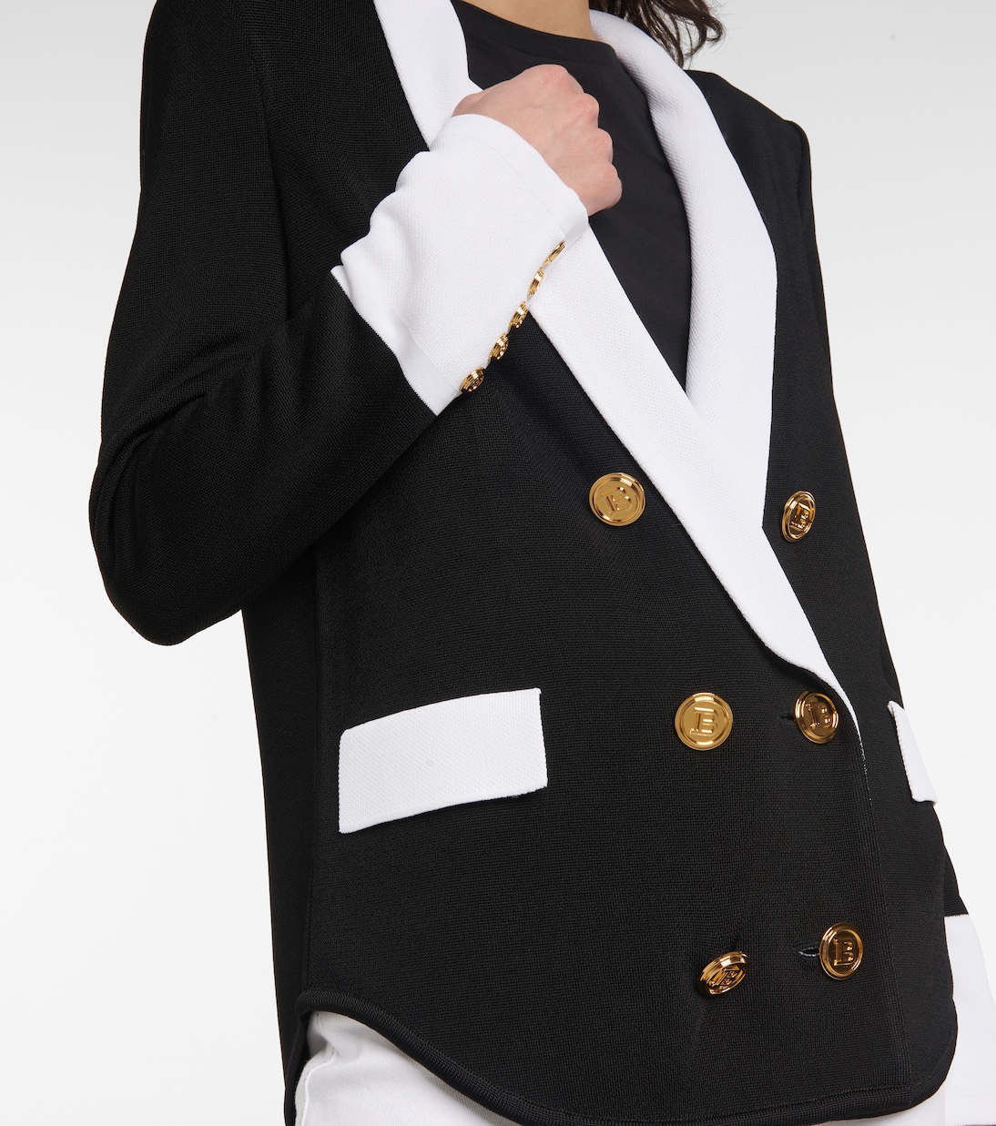 Doppelreihige Blazer sind ein Signature Design von Balmain, dabei ist dieses schwarze Modell besonders chic. Es besitzt ein kontrastierendes Revers sowie einen abgerundeten Saum und ist mit den charakteristischen B-Knöpfen in Goldfarben versehen.