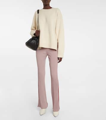 These pants from Jil Sander will add a contemporary edge to your wardrobe. They're rib-knitted with a high rise, flared legs, and contrast striped detailing.