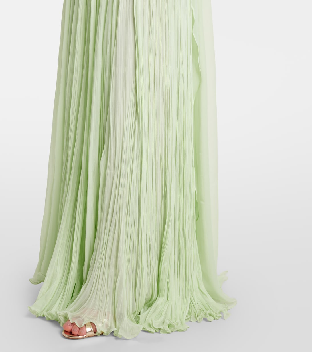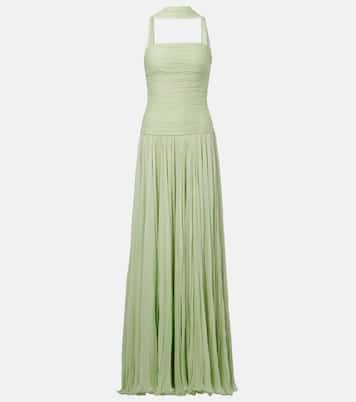 Special occasions are all the more memorable with this gown from Marmar Halim. The design is crafted from flowing silk georgette with ruched detailing, a hand-pleated skirt, and a scarf detail.